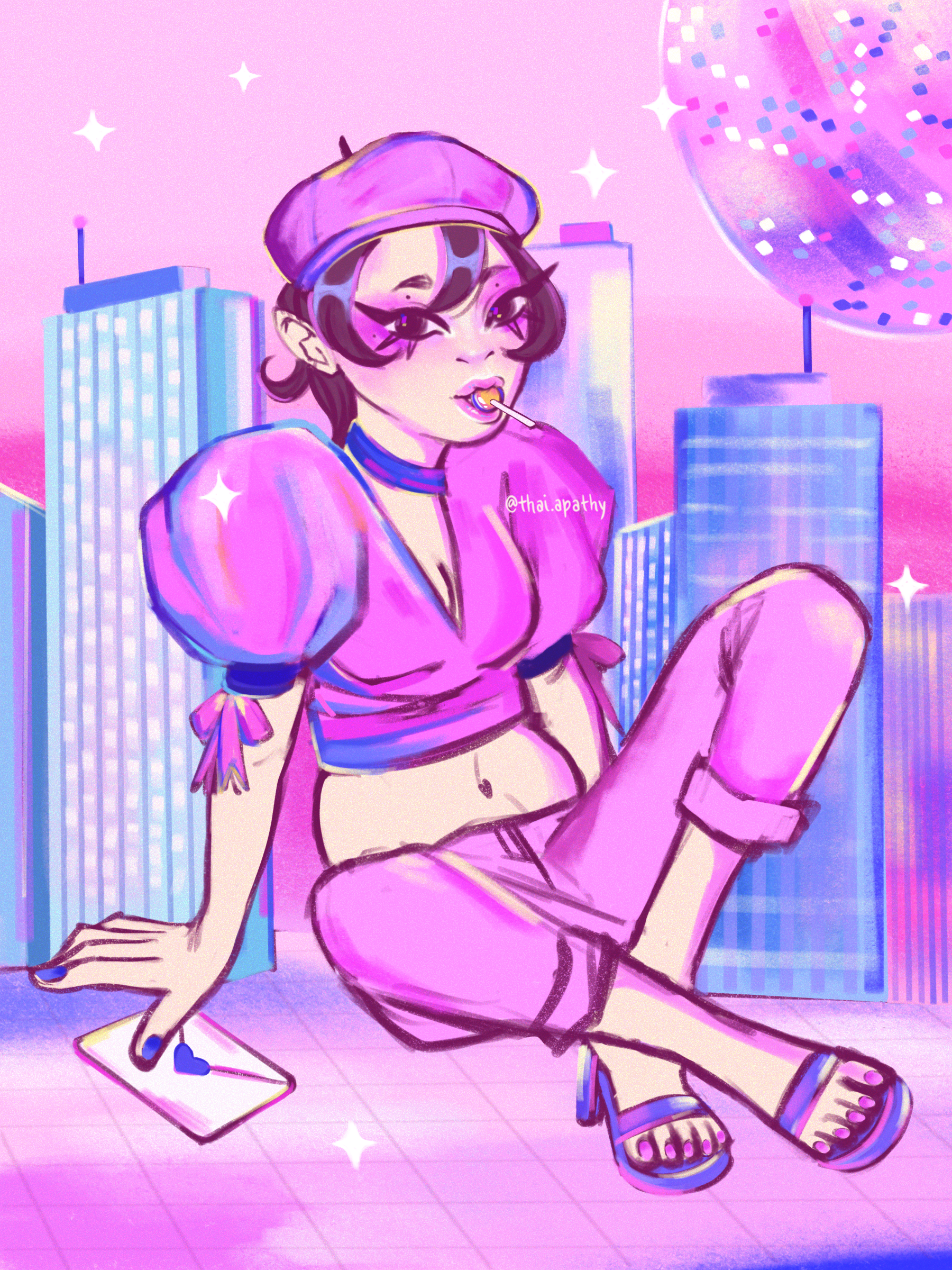 This illustration was based on a deep appreciationĀ for Japanese city pop aesthetics. The dreamy city life disco scape mixed with a love for the color pink led to the creation of this piece.